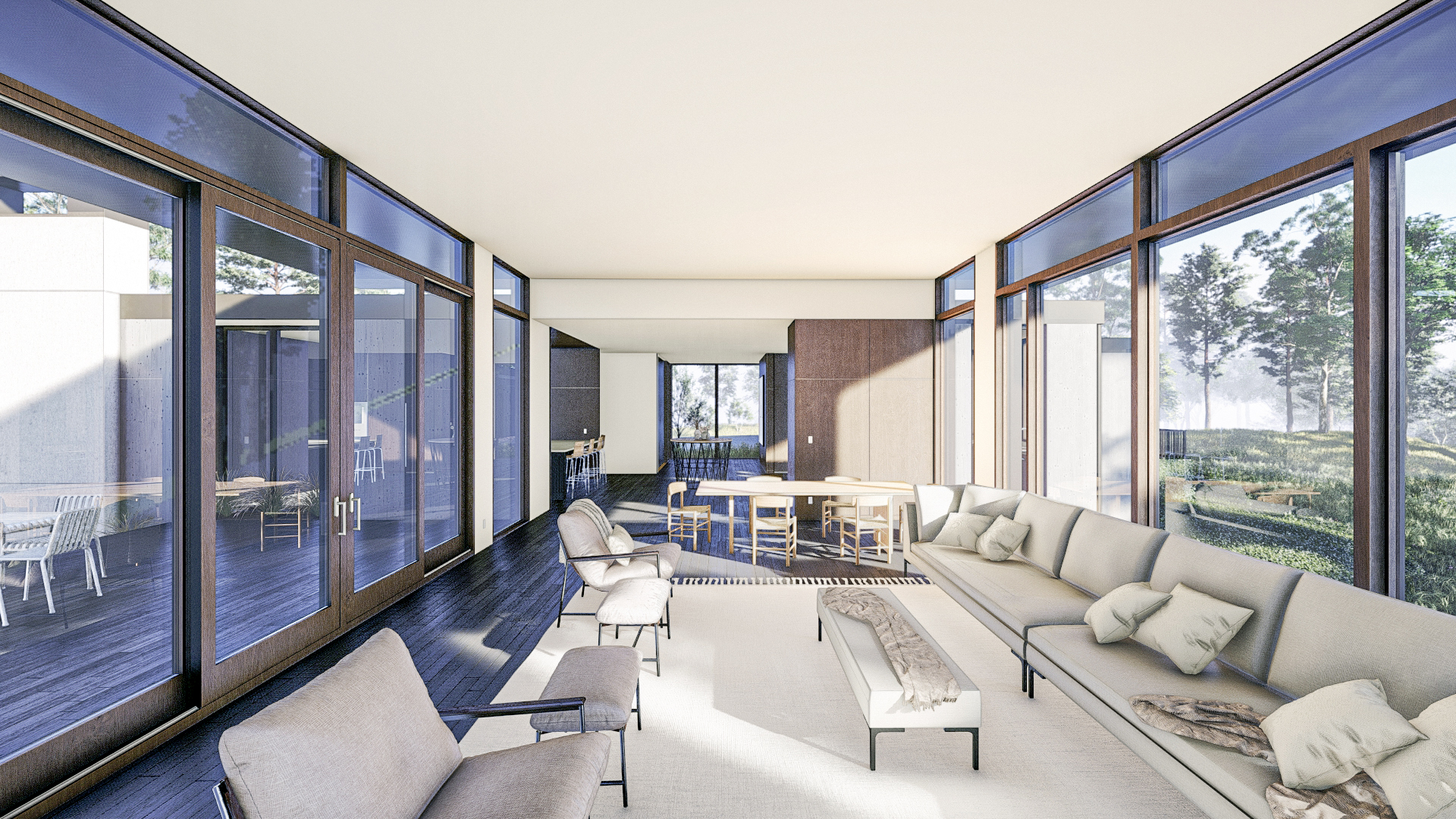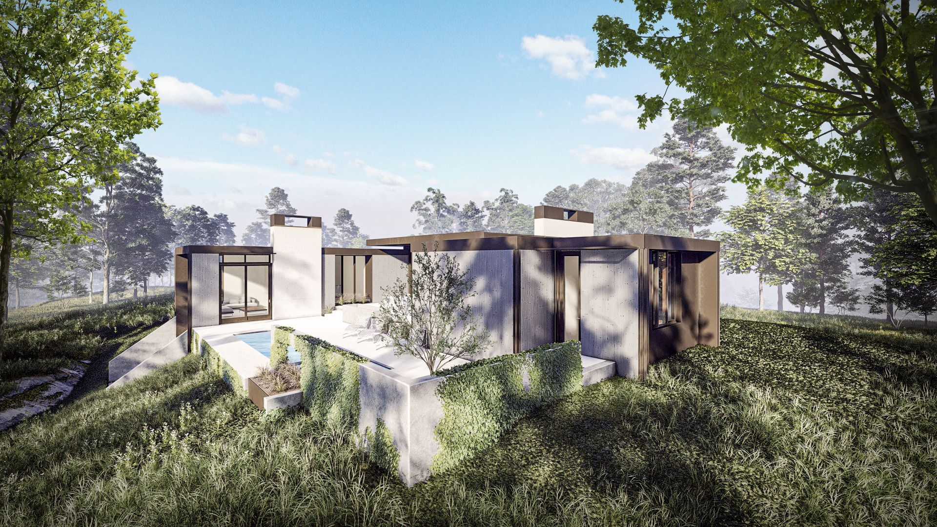The Blandemar Residence embodies our commitment to crafting personalized, sustainable homes that reflect modern living standards. Nestled in a serene setting, this residential project combines luxury with eco-conscious design. The residence is tailored to meet the specific needs and preferences of its active owners. The home is an ambitious balance of site and program tucked away in the hills of central Virginia. The site presented a few key challenges that limited the overall area available for the new build site. To accommodate those limitations we crafted a sequence of spaces that flow along the ridge line of the hill at the heart of the site. The spaces within the interlocking volumes are configured for a carefeullyinternal life while always maintaining a strong visual and physical connection to the hardwood forest that surrounds the home.