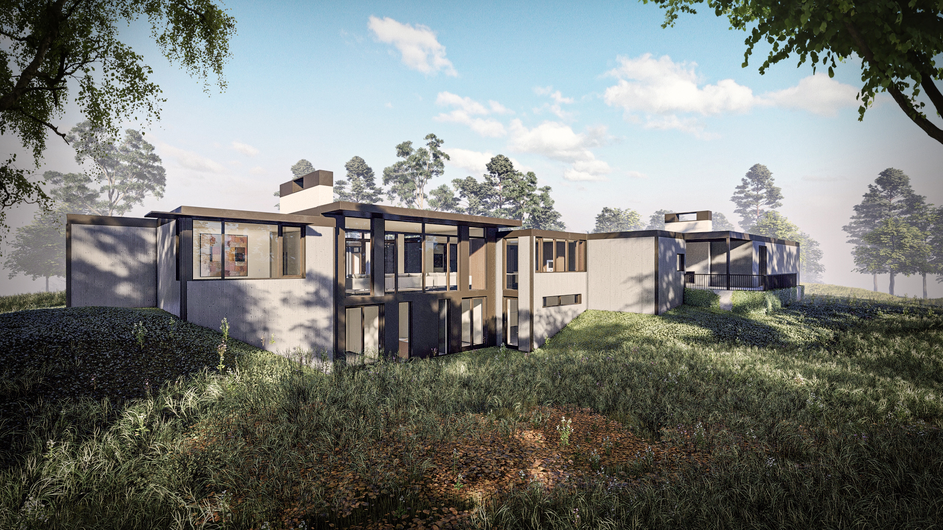 The design integrates natural materials and energy-efficient technologies, including solar panels and high-performance insulation, to minimize environmental impact. Spacious interiors are enhanced by large windows that maximize natural light and offer breathtaking views of the surrounding landscape. The open-plan layout fosters a sense of flow and connectivity throughout the home.