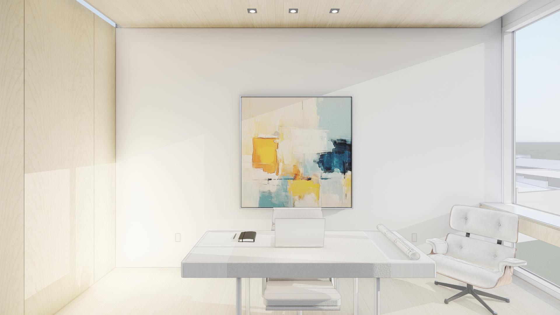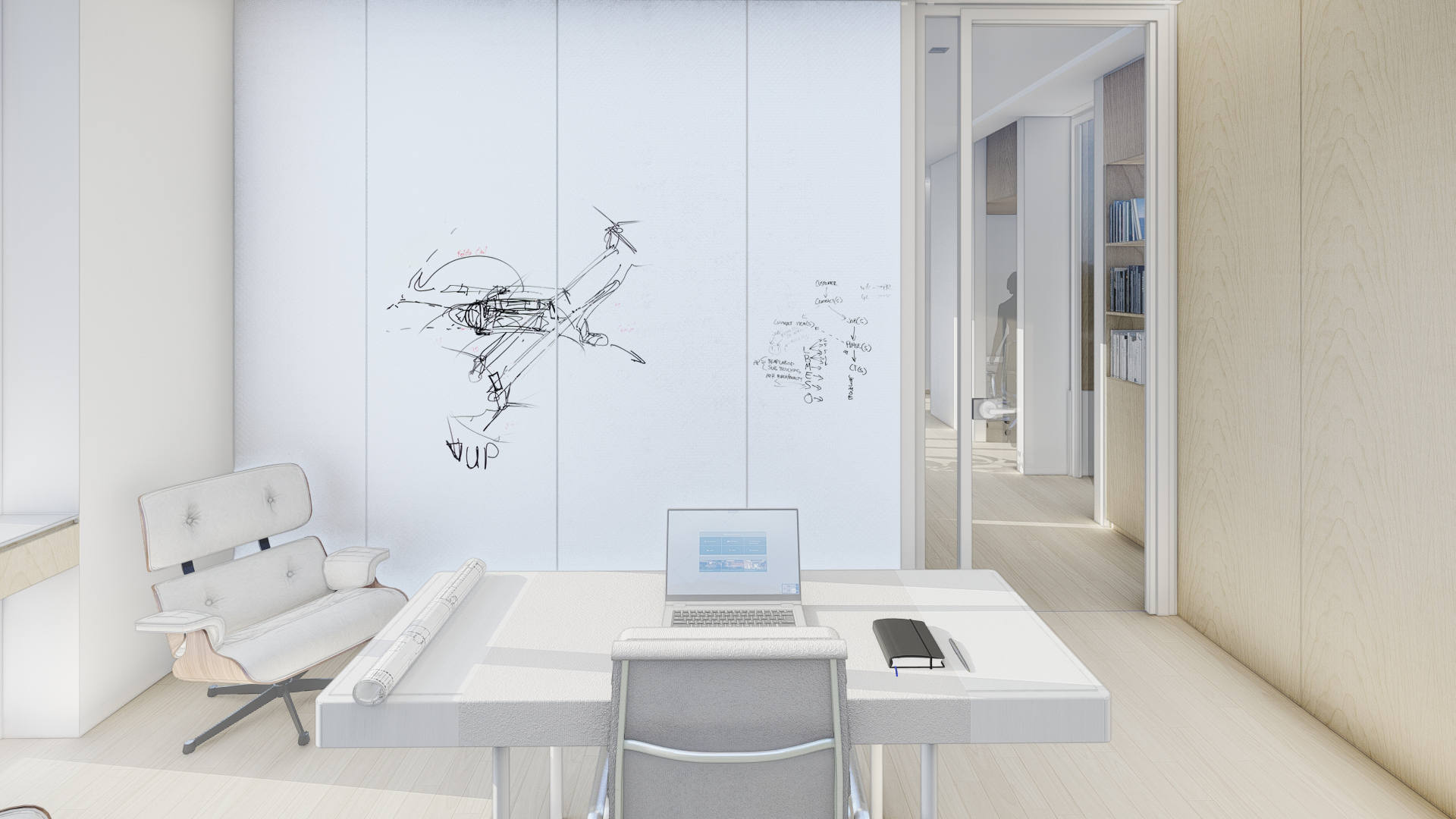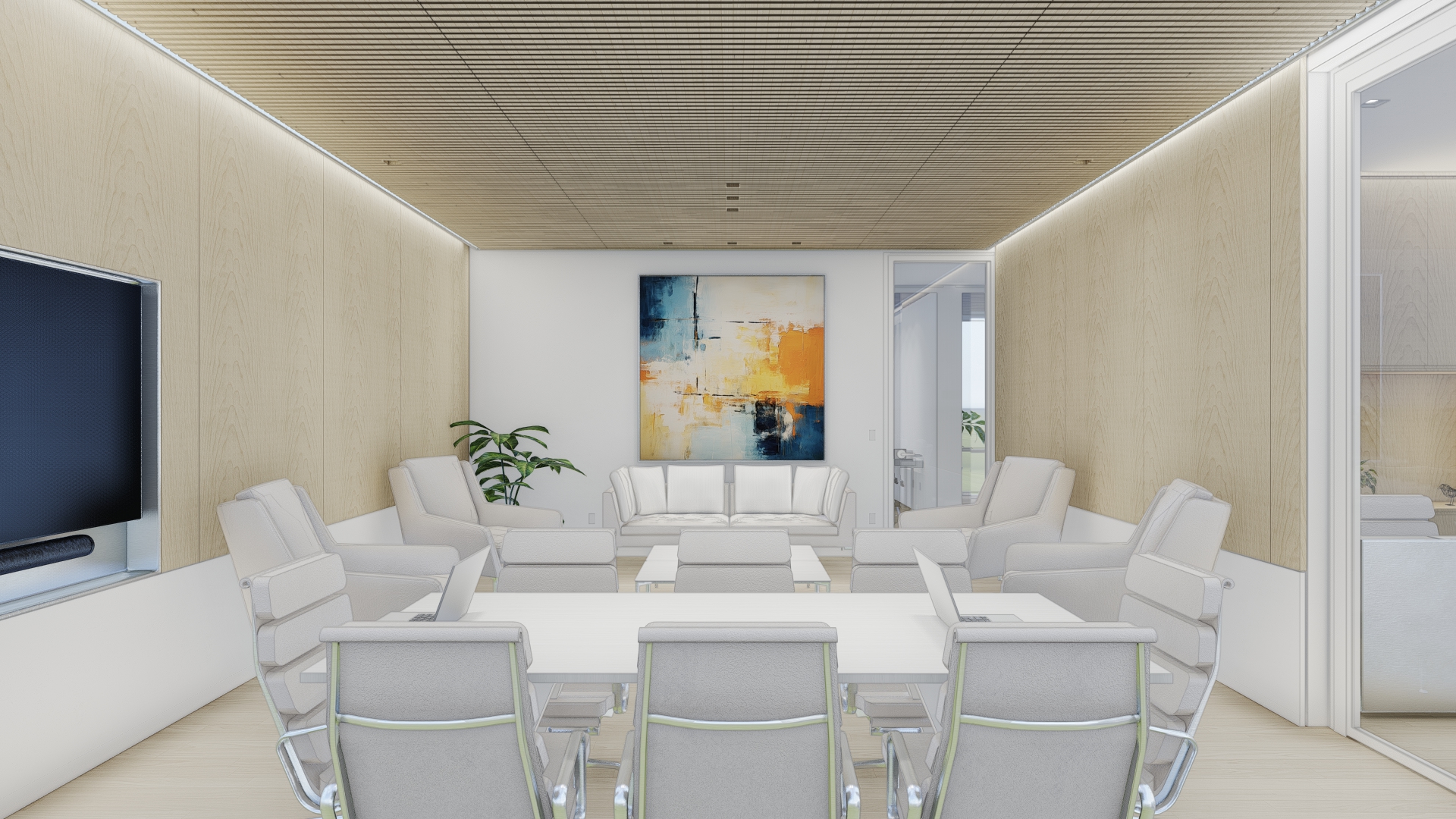 The material palette takes on a Nordic feel through the careful use of Ash wood and soft warm tones in the furnishings. Technology for collaborative work is embedded into the architecture so it can be deployed when needed and hidden the rest of the time.